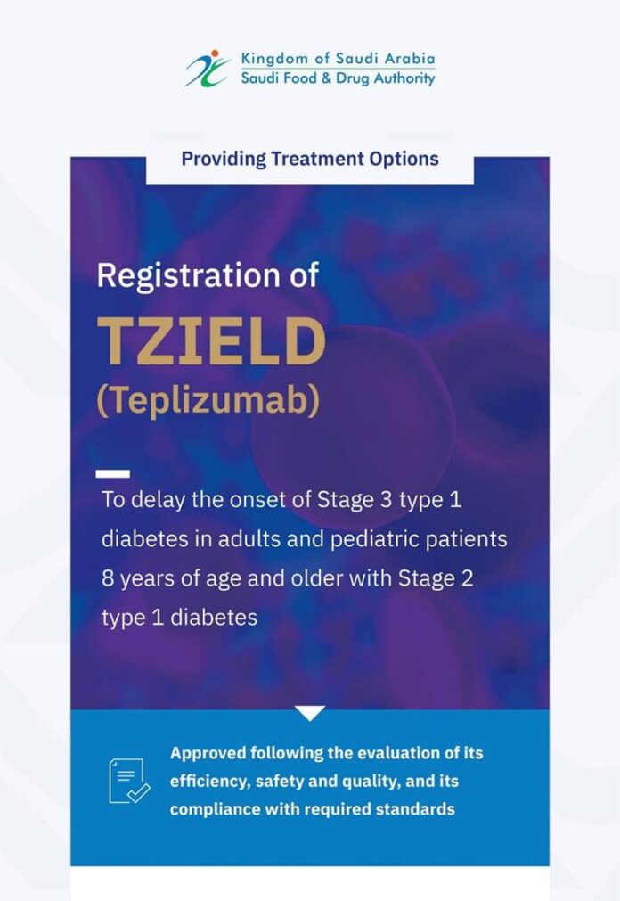 سازمان غذا‌و‌داروی عربستان (SFDA) داروی تی‌زیلد (Tzield) / تپلیزوماب (Teplizumab) را برای به تأخیر انداختن بروز دیابت نوع یک مرحله ۳ در بزرگسالان و کودکان ۸ سال به بالا با دیابت نوع یک مرحله ۲ (T۱D) تأیید کرد.