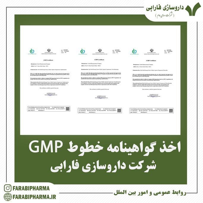 اطلاعیه روابطعمومی و امور بینالملل شرکت داروسازی فارابی: فارابی که بزرگترین تولیدکننده آنتیبیوتیک خوراکی در کشور است موفق به دریافت گواهینامه GMP از سازمان غذاودارو برای خطوط تولید پنیسیلین، غیر بتالاکتام(جنرال) و سفالوسپورین شد.