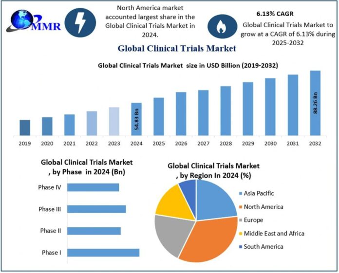 بازار جهانی آزمایشهای بالینی در سال ۲۰۲۴ با ارزش ۵۴.۸۳ میلیارد دلار ارزیابی شد و پیشبینی میشود تا سال ۲۰۳۲ به ۸۸.۲۶ میلیارد دلار برسد و نرخ رشد مرکب سالانه ۶.۱۳ درصد را ثبت کند.