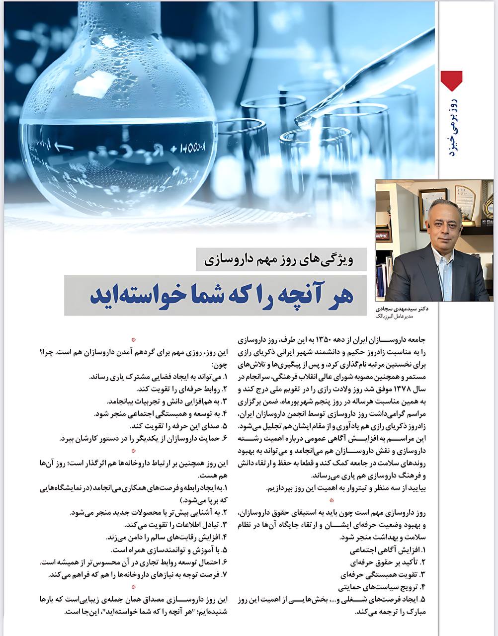 یادداشتی از دکتر سیدمهدی سجادی؛ (مدیرعامل البرزبالک): جامعه داروسازان ایران از دهه ۱۳۵۰ به این طرف، روز داروسازی را به مناسبت زادروز حکیم و دانشمند شهیر ایرانی زکریای رازی برای نخستین مرتبه نامگذاری کرد، و پس از پیگیریها و تلاشهای مستمر و همچنین مصوبه شورای عالی انقلاب فرهنگی، سرانجام در سال ۱۳۷۸ موفق شد روز ولادت رازی را در تقویم ملی درج کند و به همین مناسبت هرساله در روز پنجم شهریورماه، ضمن برگزاری مراسم گرامیداشت روز داروسازی توسط انجمن داروسازان ایران، زادروز زکریای رازی هم یادآوری و از مقام ایشان هم تجلیل میشود.