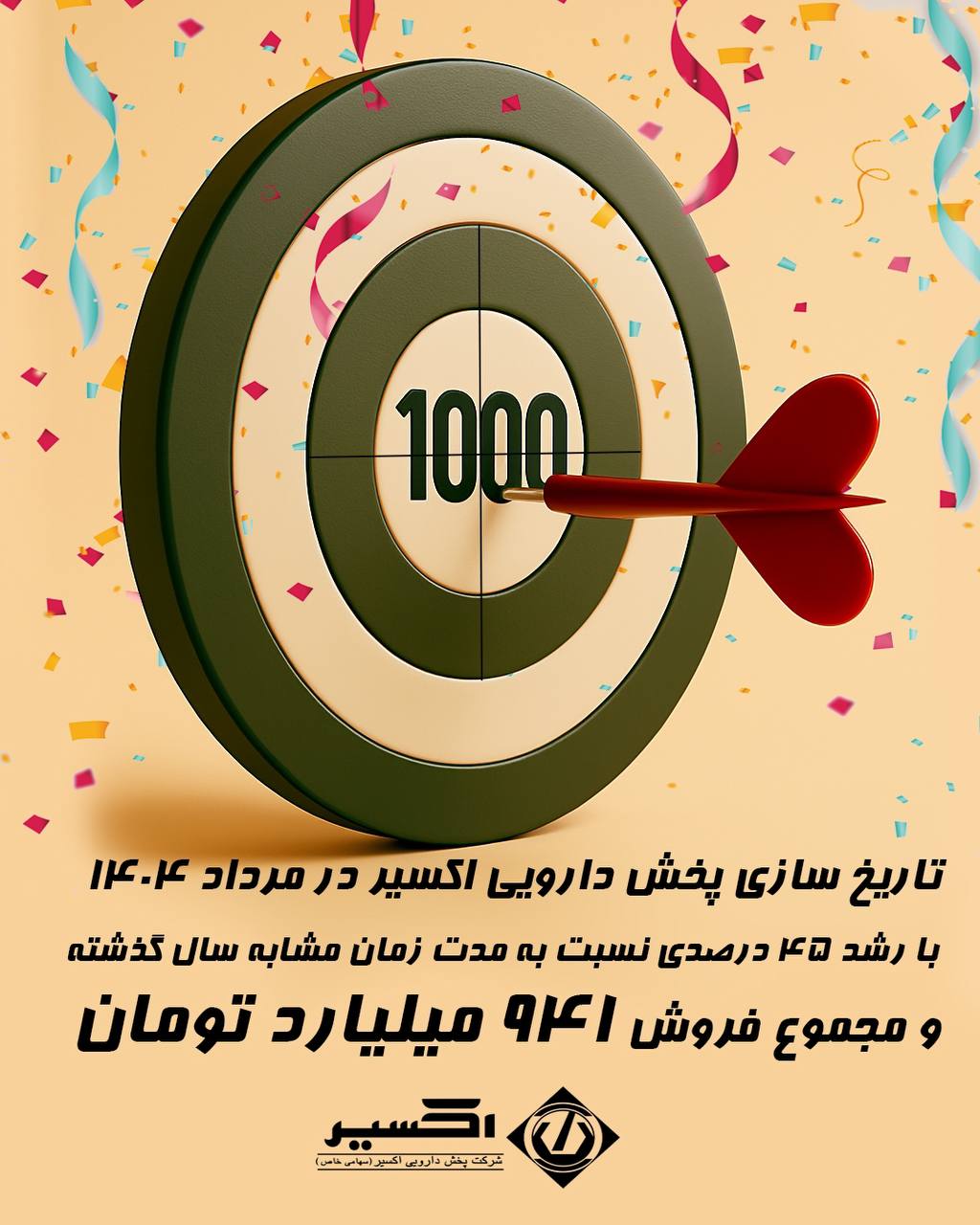 شرکت پخش دارویی اکسیر، در ادامه رکوردشکنیهای مستمر و در امتداد عملکرد درخشان خود (که در مرداد ۱۴۰۳ موفق به ثبت رکورد فروش ۶۴۸ میلیارد تومانی شده بود)، در مرداد ۱۴۰۴ با رشد ۴۵ درصدی و مجموع فروش ۹۴۱ میلیارد تومانی، تاریخساز شد!