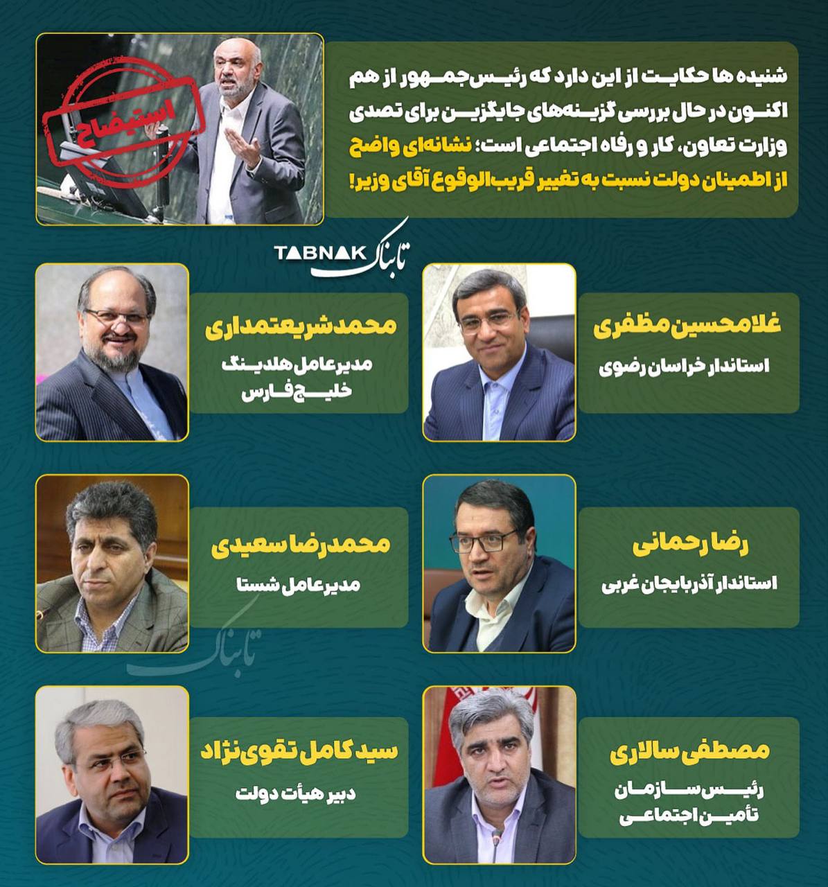 بر اساس پیشبینی تابناک، وزیر تعاون، کار و رفاه اجتماعی، استیضاح و برکنار خواهد شد.