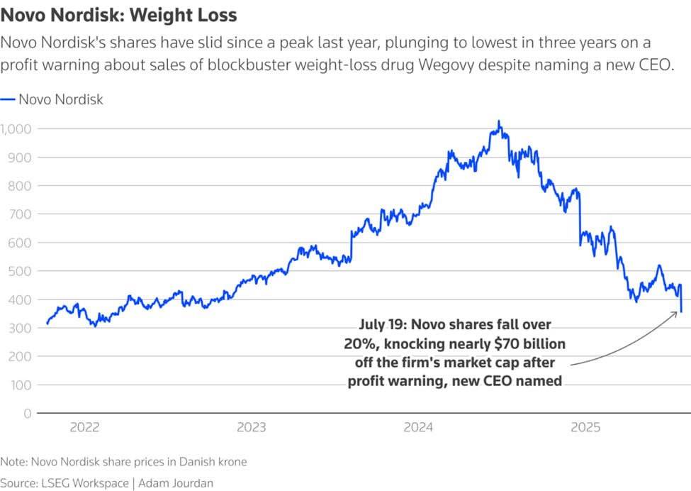 Investors wiped $70 billion off Novo Nordisk’s market value on Tuesday after the maker of weight-loss drug Wegovy issued a profit warning and named a new CEO, as it battles rising competition in the obesity drug market.